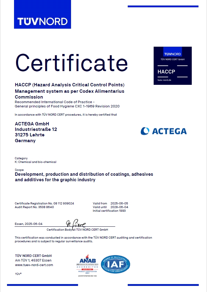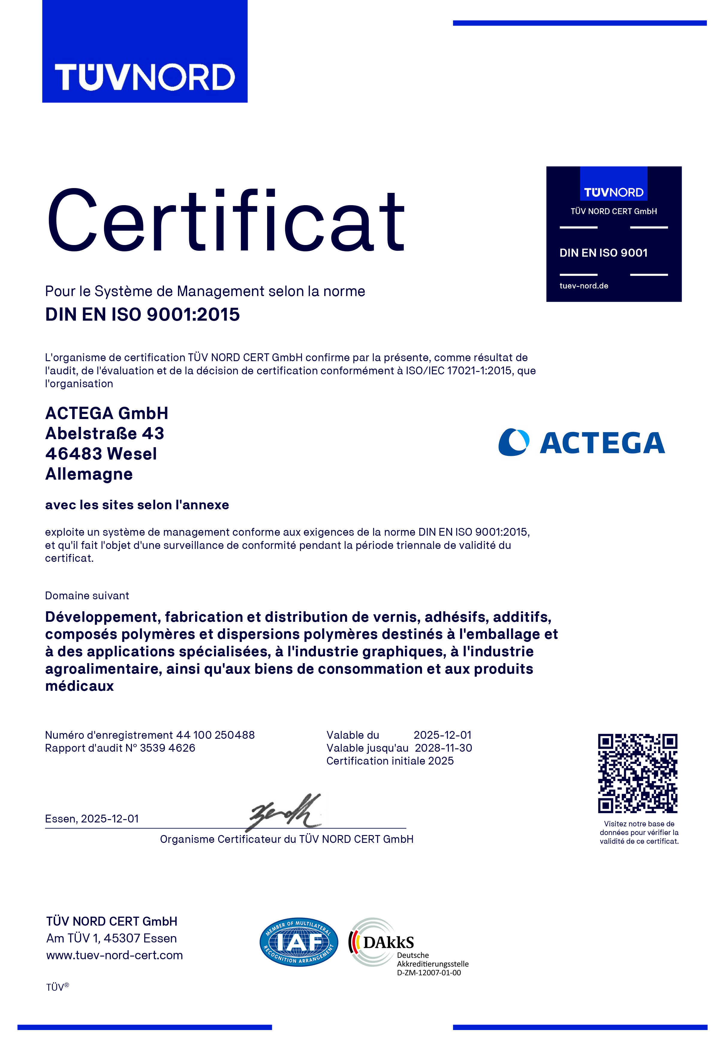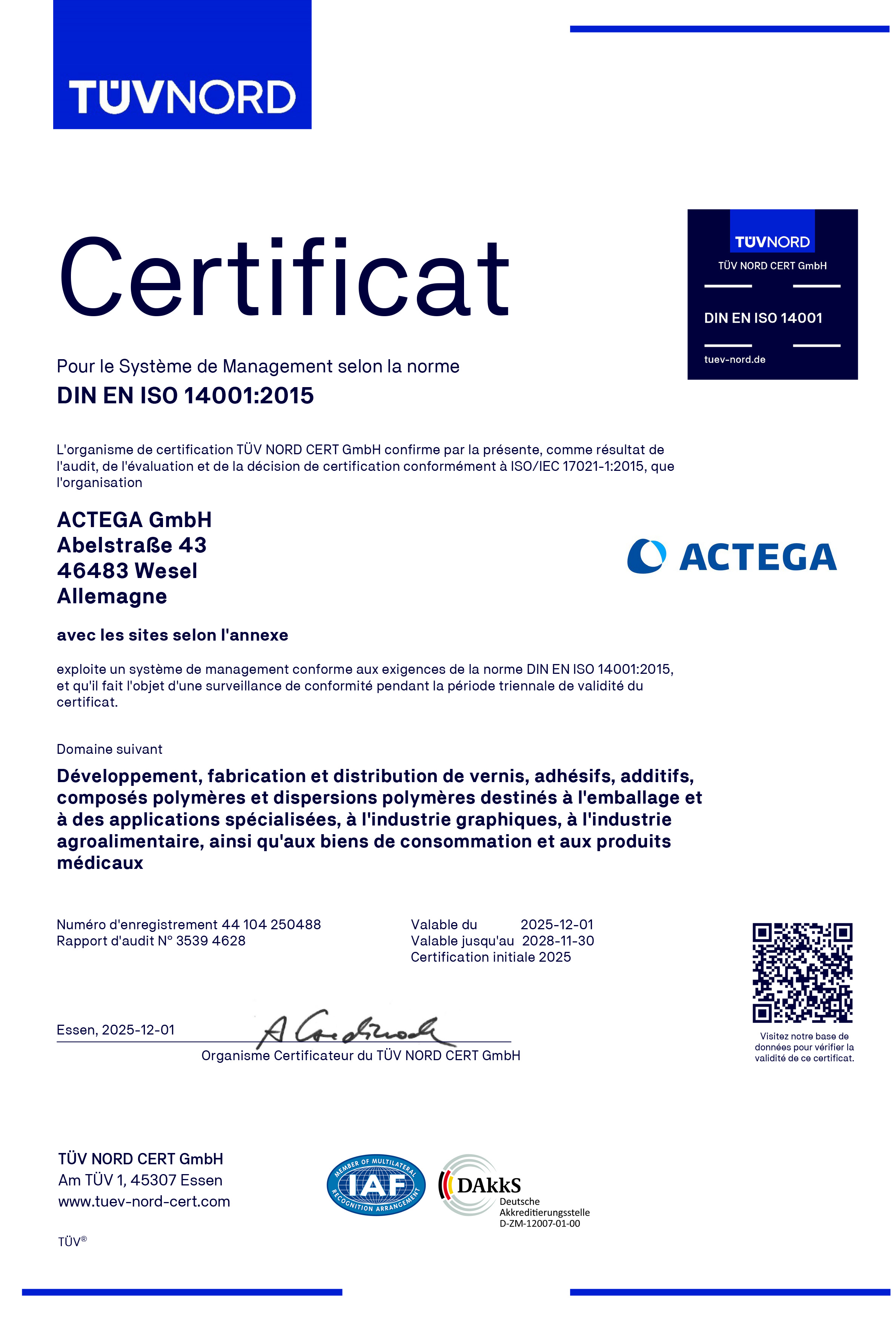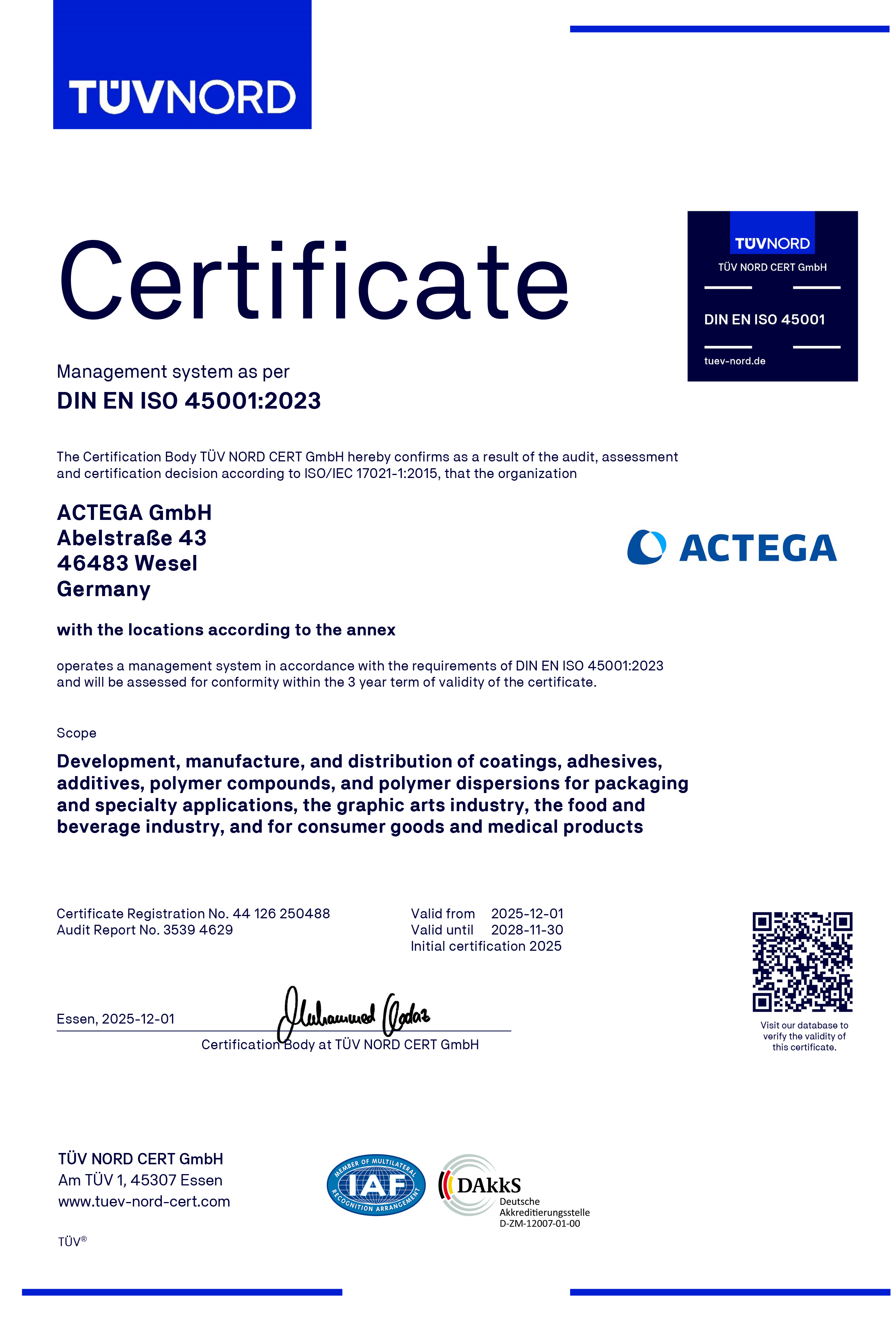 The numerous certifications obtained by ACTEGA’ sites over the years are proof of our efforts and commitment in various fields, ranging from the quality of products and processes to services, solution and supply. We also carry out specific, aimed audits, according to our customers’ needs, in order to assess individual suppliers.