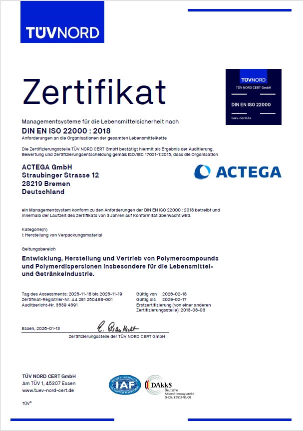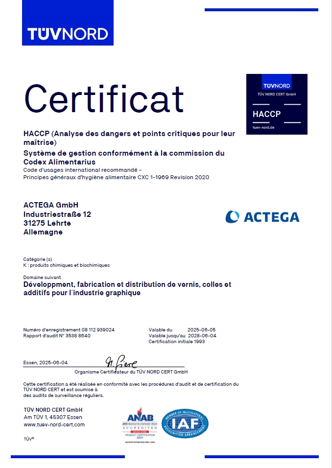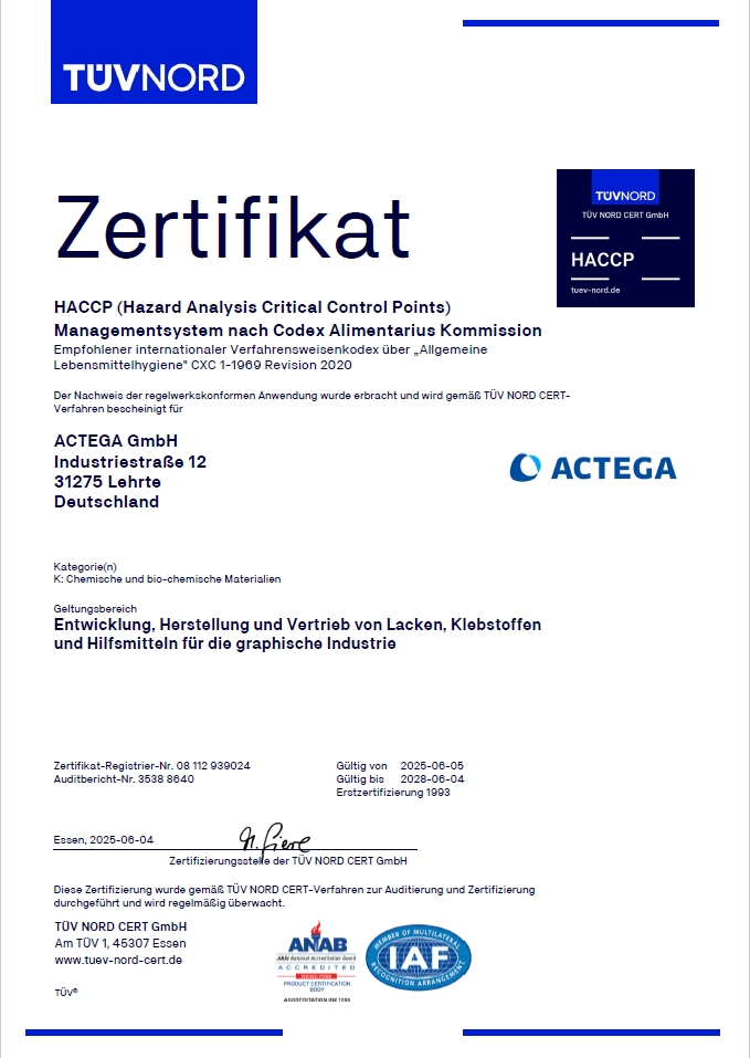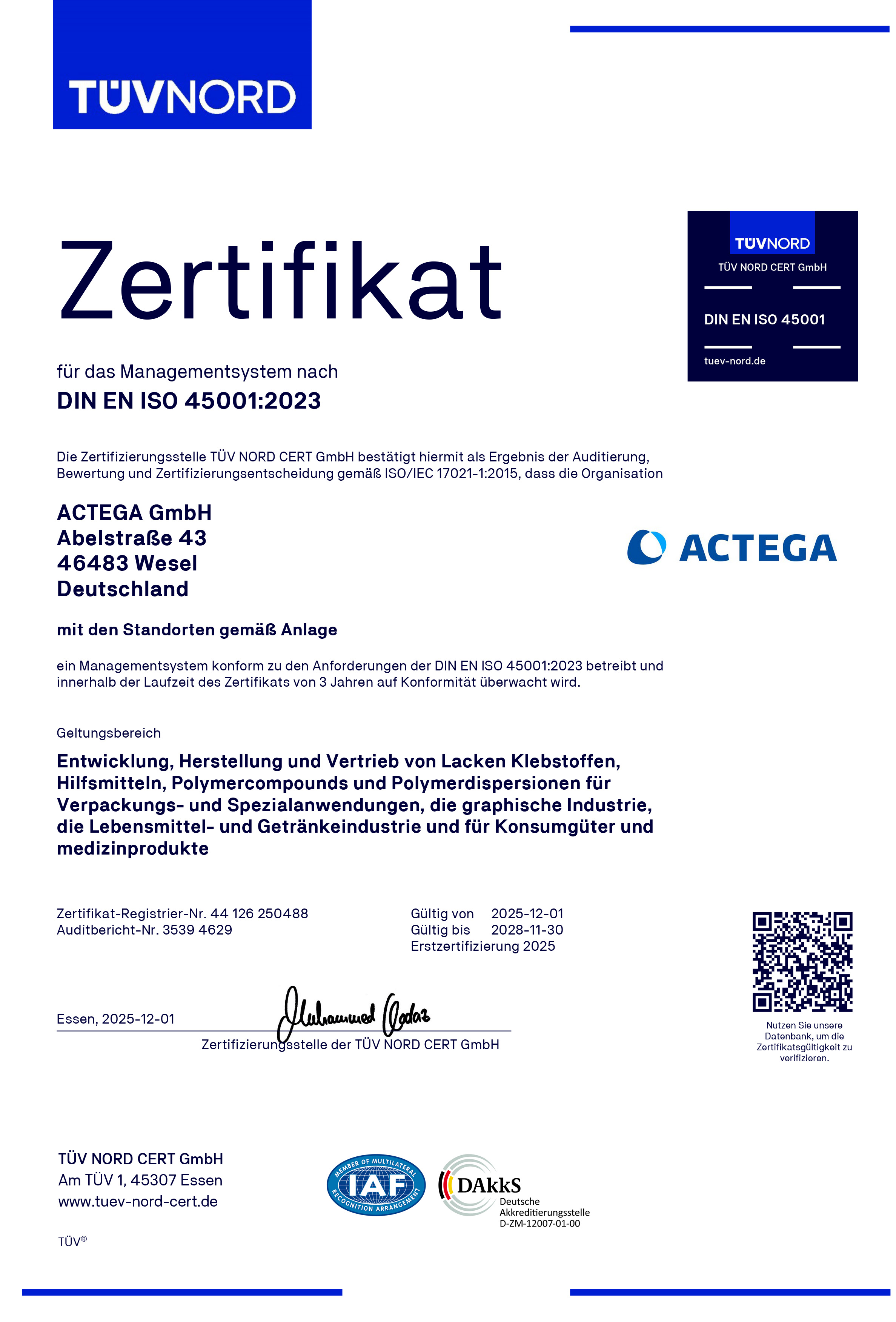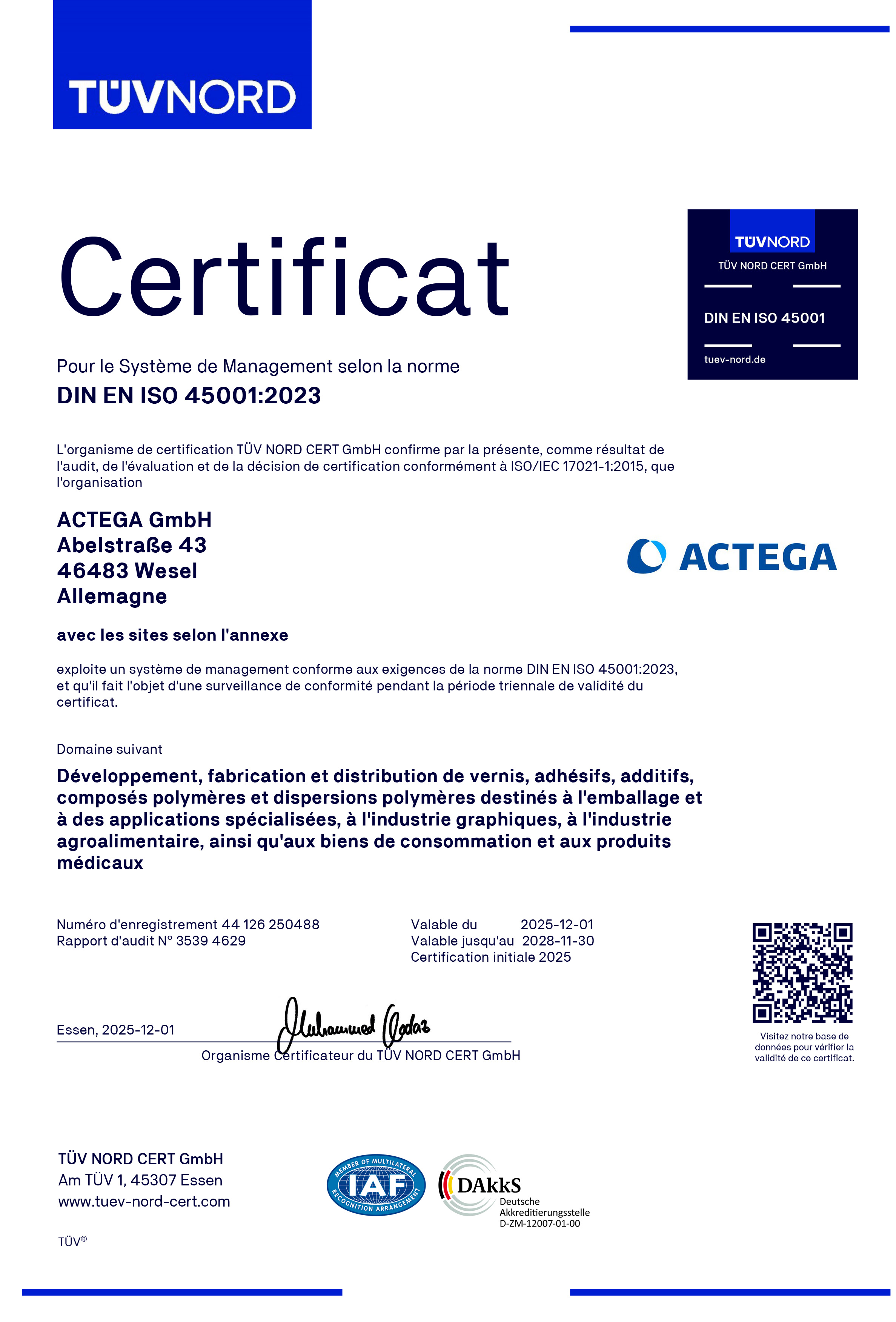 The numerous certifications obtained by ACTEGA’ sites over the years are proof of our efforts and commitment in various fields, ranging from the quality of products and processes to services, solution and supply. We also carry out specific, aimed audits, according to our customers’ needs, in order to assess individual suppliers.