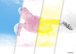 While the water-based high gloss coating was used over the entire surface from the coating unit, our water-based dull matt varnish was partially applied to the turtle and sand.
